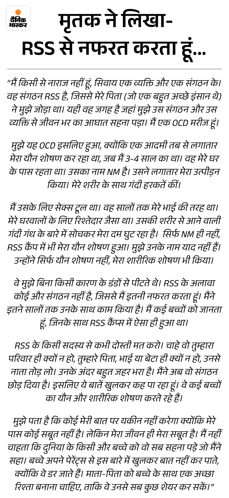 सुसाइड नोट में संघ के खिलाफ कुछ संदिग्ध और निराधार आरोप हैं, जिन्हें उन्होंने अपनी आत्महत्या का कारण बताया है। हमने जिला पुलिस को एक लिखित याचिका देकर मामले की निष्पक्ष जांच की मांग की है। हमें भरोसा है कि स्वतंत्र जांच से साबित हो जाएगा कि RSS निर्दोष है।