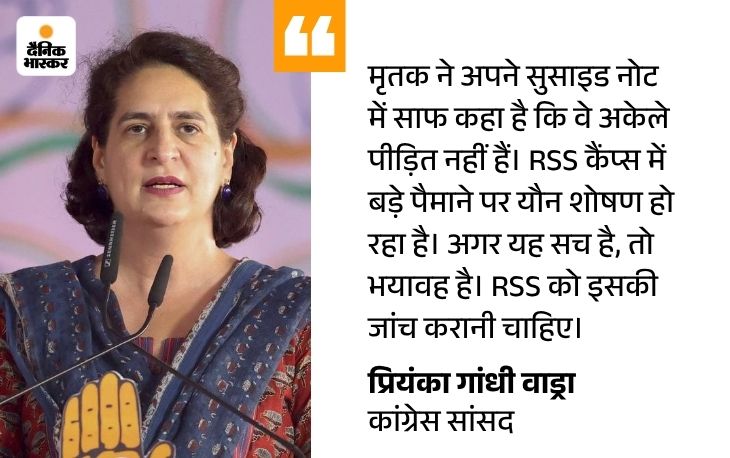 प्रियंका बोलीं- लड़कों से शोषण का दायरा लड़कियों जितना ही बड़ा कांग्रेस सांसद प्रियंका गांधी ने मृतक के आरोपों पर RSS से जवाब मांगा। प्रियंका ने 12 अक्टूबर को X पर लिखा- RSS को मामले पर तत्काल सफाई देनी चाहिए। पूरे देश में लाखों बच्चे और नाबालिग इन कैंप्स में जाते हैं। लड़कों के साथ भी लड़कियों के जितना ही यौन शोषण हो रहा है। इन जघन्य अपराधों पर चुप्पी तोड़नी होगी।