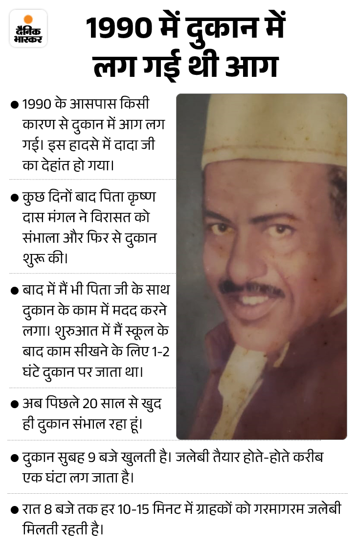 बतौर तीसरी पीढ़ी दुकान संभाल रहे भरत मंगल के अनुसार, मेरे दादा जी भगवानदास मंगल ने सौ साल पहले इस दुकान की शुरुआत की थी। तब छावनी में बड़ी अनाज मंडी हुआ करती थी। उस वक्त छावनी इलाका एक तरह से शहर का सेंटर पॉइंट था। शहर के हर वर्ग के लोग खान-पान के लिए छावनी की इन तंग गलियों में ही पहुंचते थे।