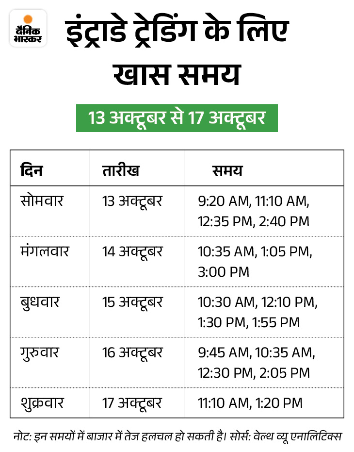 अहम तारीखों पर नजर: रिपोर्ट में 17 अक्टूबर, शुक्रवार को बाजार के लिए अहम तारीख बताई गई है। वेल्थ व्यू की रिपोर्ट के अनुसार इस दिन बाजार में तेज मोमेंटम दिख सकता है।