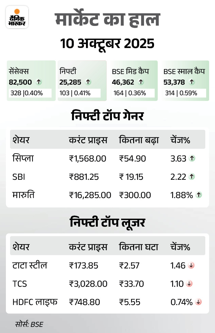 वहीं हफ्ते के आखिरी कारोबारी दिन शुक्रवार, 10 अक्टूबर को सेंसेक्स 328 अंक चढ़कर बंद हुआ। निफ्टी में भी 103 अंक की तेजी रही। सेंसेक्स के 30 शेयरों में से 22 में तेजी और 8 में गिरावट रही। PSU बैंक, रियल्टी और फार्मा सेक्टर में सबसे ज्यादा तेजी दिखी।