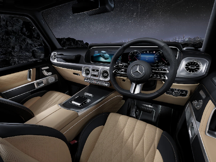 G 450d का इंटीरियर पहले की तरह प्रीमियम है, जैसा कि G-क्लास से उम्मीद होती है। केबिन में डुअल-टोन नापा लेदर सीट्स और AMG लाइन थीम दी गई है, जो इसे अंदर से लग्जरी लुक देती है। डैशबोर्ड पर कॉन्ट्रास्टिंग मैटेलिक इंसर्ट्स भी हैं, जो इसे और अट्रेक्टिव बनाते हैं।