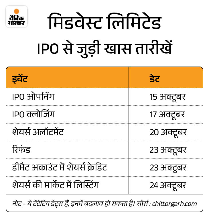 मिडवेस्ट के शेयरों का अलॉटमेंट 20 अक्टूबर को होगा। बॉम्बे स्टॉक एक्सचेंज (BSE) और नेशनल स्टॉक एक्सचेंज (NSE) दोनों पर 24 अक्टूबर को शेयर्स की लिस्टिंग होगी।