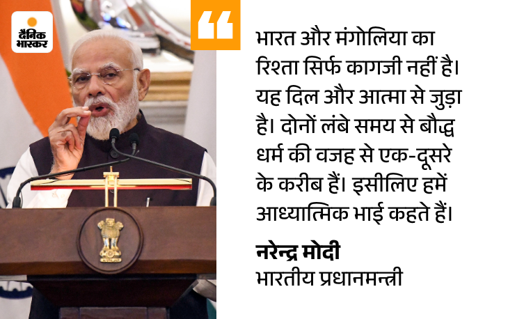 पीएम मोदी ने कहा कि भारत मंगोलिया के विकास में मजबूत और भरोसेमंद दोस्त बनेगा। उन्होंने कहा- हालांकि हमारी सीमा नहीं मिलती, लेकिन हम मंगोलिया को नजदीकी दोस्त मानते हैं। दोनों देश मिलकर ग्लोबल साउथ की आवाज को मजबूत करेंगे। वहीं, उखना ने व्यापार के लिए नए रास्तों की बात की।