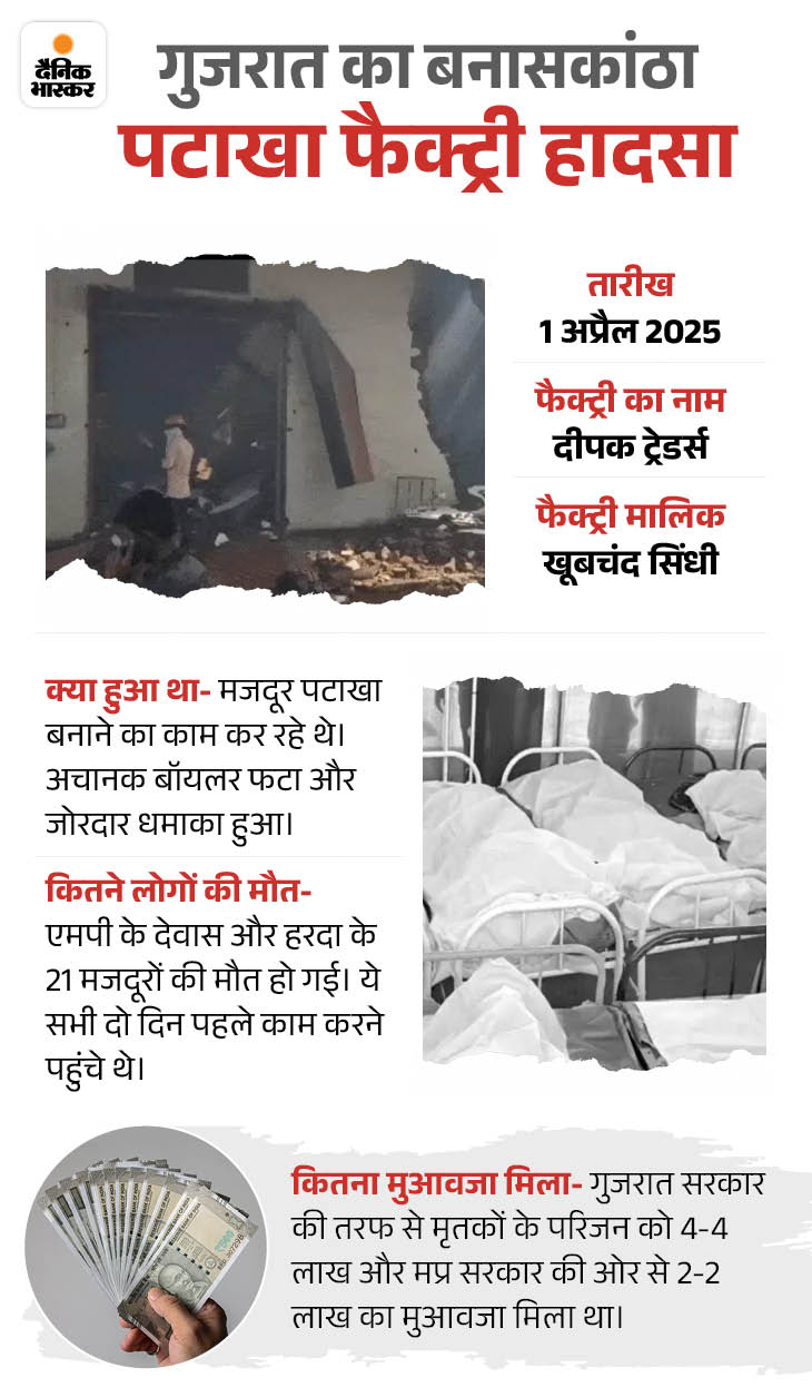 गुजरात के बनासकांठा में पटाखा फैक्ट्री में हुए धमाके में एमपी के 21 मजदूरों की मौत हुई थी।