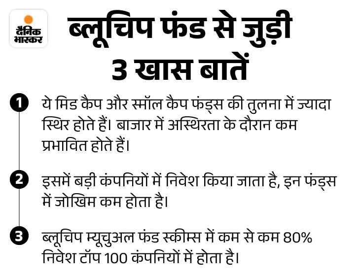 ब्लूचिप म्यूचुअल फंड स्कीमों के लिए निवेशकों से जुटाई गई राशि का कम से कम 80% टॉप 100 कंपनियों जैसे रिलायंस, HDFC बैंक, TCS, इंफोसिस, हिंदुस्तान यूनिलीवर, ITC और ICICI बैंक में निवेश करना जरूरी होता है। माना जाता कि इनके शेयरों में उतार चढ़ाव कम होता है, इसलिए इनमें पैसा लगाने पर नुकसान की संभावना, खासतौर पर लंबे समय में कम ही रहती है।