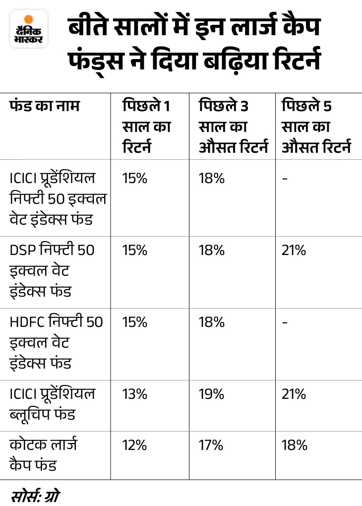 लार्ज कैप म्यूचुअल फंड स्कीम्स के लिए निवेशकों से जुटाई गई रकम का कम से कम 80% टॉप 100 कंपनियों में निवेश करना जरूरी है। हालांकि निवेश से पहले फंड का पिछला प्रदर्शन, फंड मैनेजर की विशेषज्ञता, और एक्सपेंस रेशियो देखना चाहिए।