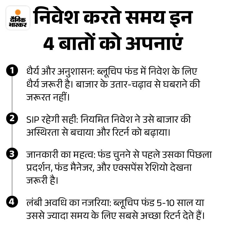 इसमें किसे करना चाहिए निवेश? ब्लूचिप फंड्स में उनको पैसा लगाने की सलाह दी जाती है, जो कम जोखिम के साथ शेयर बाजार में निवेश करना चाहते हैं। इन स्कीम्स में कम से कम 3 से 5 साल के टाइम पीरियड को ध्यान में रख कर निवेश करना चाहिए। हालांकि इसमें कोई लॉक-इन पीरियड नहीं होता है, इसीलिए आप जरूरत पड़ने पर पैसा निकाल सकते हैं। ध्यान रहे कि छोटे समय मे शेयर बाजार में उतार चढ़ाव का असर आपके निवेश पर अधिक पड़ सकता है, जबकि लंबे समय में यह रिस्क कम हो जाता है।