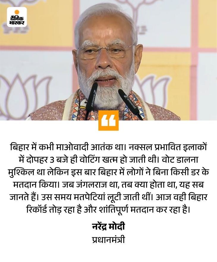 पीएम मोदी ने कहा कि पहले बिहार में माओवाद-नक्सलवाद का आतंक था। दोपहर 3 बजे ही वोटिंग खत्म हो जाती थी। अब लोग शाम तक वोटिंग होती है।