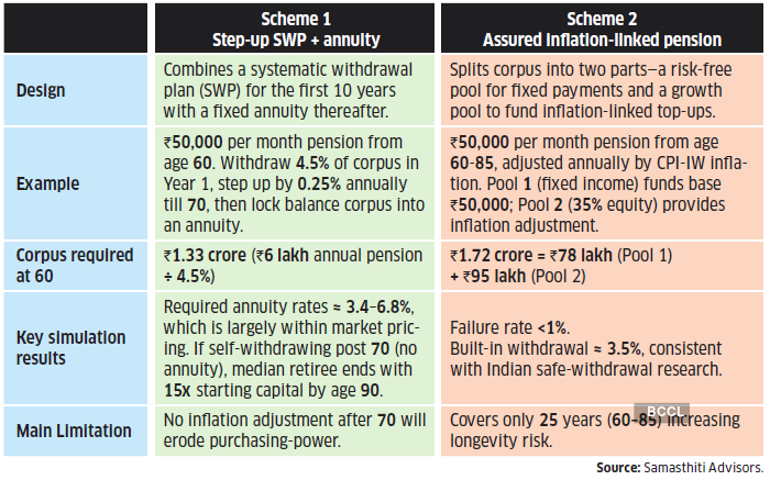 Pension Scheme 1 combines a systematic withdrawal plan (SWP) in the early years with an annuity later. A retiree begins by withdrawing 4.5 per cent of their corpus at age 60, then increases the withdrawal rate by 0.25 per cent every year for the first ten years. At age 70, the retiree locks into a fixed lifetime annuity. The plan assumes a balanced portfolio with 35 per cent in equity.