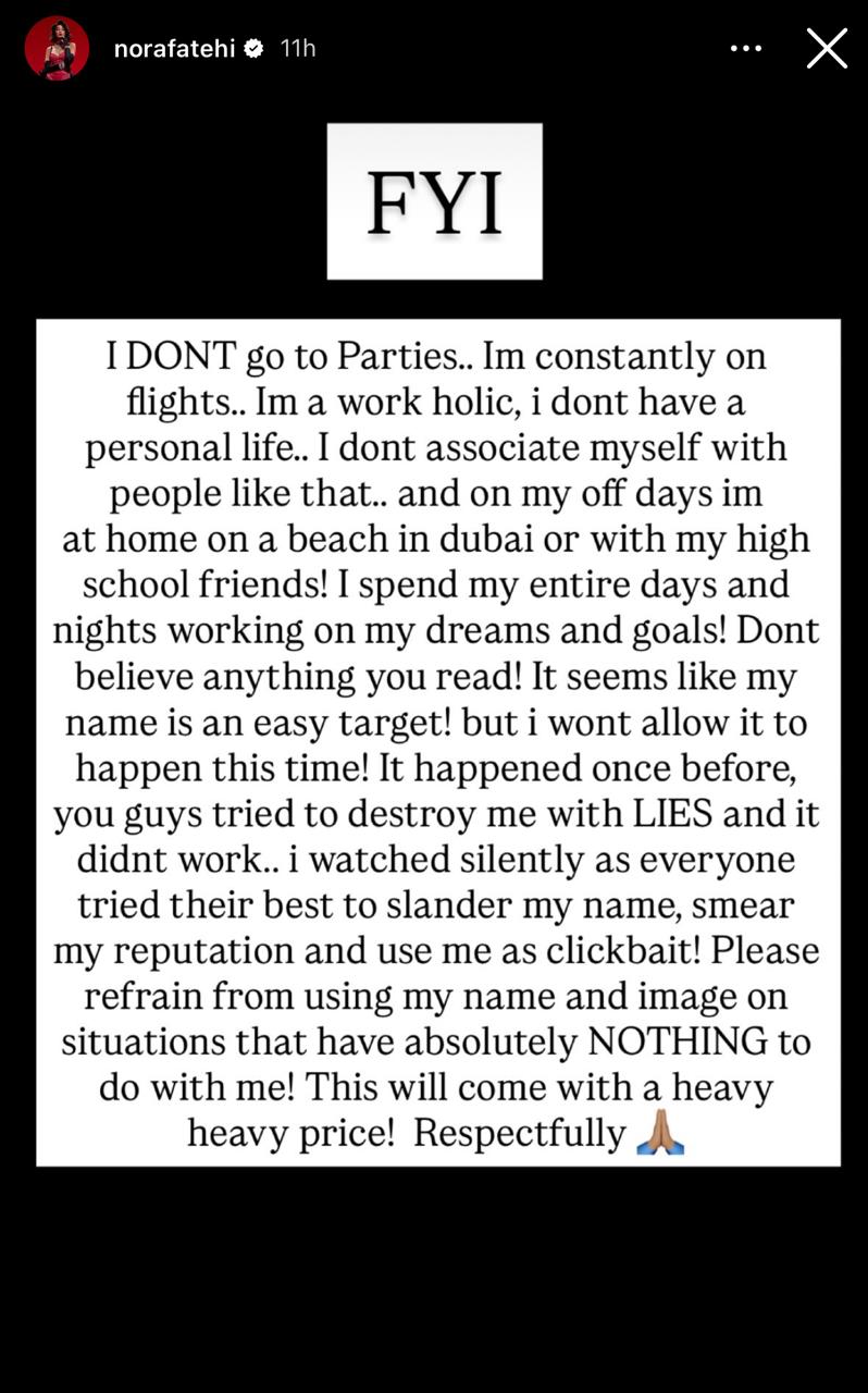 नोरा ने अपने इंस्टाग्राम पर एक लंबा पोस्ट लिखकर सफाई दी। उन्होंने लिखा है- मैं किसी पार्टी में नहीं जाती, न ही ऐसे लोगों से मेलजोल रखती हूं। मैं एक वर्कहोलिक हूं, दिन-रात काम करती हूं। मेरी कोई पर्सनल लाइफ है ही नहीं। जब छुट्टी मिलती है तो अपने दुबई वाले घर या बीच पर दोस्तों के साथ समय बिताती हूं। यही मेरी जिंदगी है।