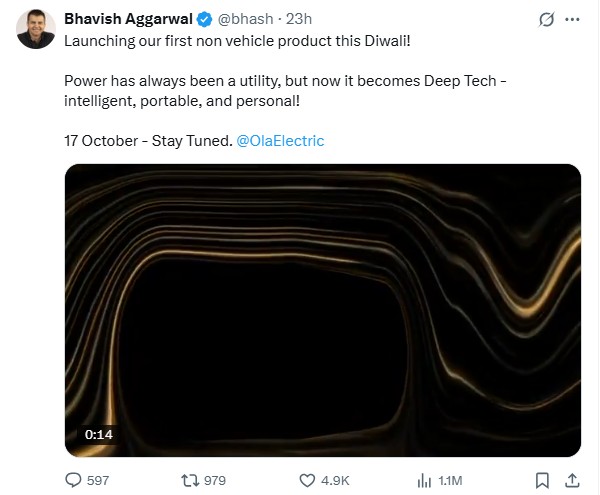 इससे पहले भाविश अग्रवाल ने एक पोस्ट किया था, जिसमें उन्होंने लॉन्च डेट 17 अक्टूबर बताई थी। इस पोस्ट में उन्होंने लिखा था, ‘इस दिवाली हम अपना पहला नॉन व्हीकल प्रोडक्ट लॉन्च कर रहे हैं। पावर हमेशा से एक यूटिलिटी रही है, लेकिन अब यह डीप टेक बन गई है – इंटेलिजेंट, पोर्टेबल और पर्सनल। 17 अक्टूबर को हमारे साथ बने रहें।’
