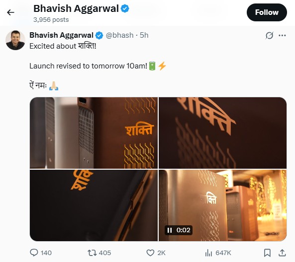 भाविश अग्रवाल ने पोस्ट में लिखा, ‘शक्ति को लेकर बहुत एक्साइटेड हूं। लॉन्च डेट को रिवाइज किया गया है। अब यह लॉन्च सुबह 10 बजे होगा। इस पोस्ट में उन्होंने अपने प्रोडक्ट की कुछ फोटोज और एक वीडियो भी शेयर किया है। फोटो में प्रोडक्ट पर शक्ति लिखा हुआ है। इससे अंदाजा लगाया जा सकता है कि उनके इस नए प्रोडक्ट का नाम शक्ति है।
