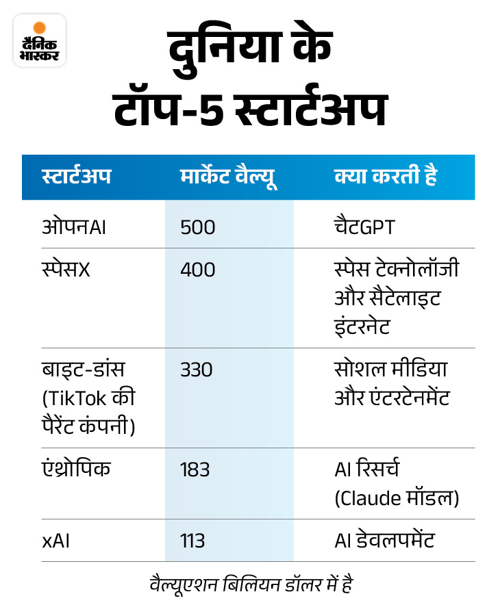 चैटGPT बनाने वाली कंपनी ओपन AI इलॉन मस्क की स्पेस-X को पीछे छोड़कर दुनिया की सबसे बड़ी स्टार्टअप बन गई है। क्योंकि एक डील में कंपनी की वैल्यूएशन 500 बिलियन डॉलर (44.3 लाख करोड़ रुपए) से ज्यादा आंकी गई, जो स्पेस-x से ज्यादा है। स्पेसएक्स की वैल्यू 400 बिलियन डॉलर है।