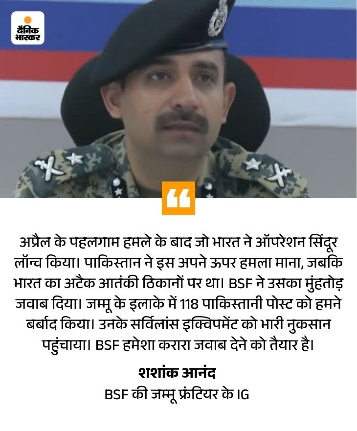 इससे पहले 30 नवंबर को जम्मू के बीएसएफ कैंपस में एनुअल प्रेस कॉन्फ्रेंस आयोजित की गई थी। इस दौरान BSF की जम्मू फ्रंटियर के IG शशांक आनंद ने बताया, ‘साल 2025 में अब तक BSF ने पाकिस्तान की 118 चौकियां तबाह की हैं। सरकार ने हमें जीरो घुसपैठ का टारगेट दिया है। हम उसको पूरा करेंगे।’