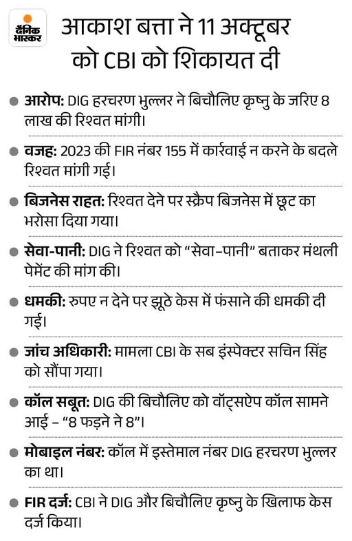 सीबीआई ने यह कार्रवाई शिकायतकर्ता अकाश बत्ता की लिखित शिकायत के आधार पर की थी। शिकायत में आरोप लगाया गया था कि डीआईजी भुल्लर ने एक बिचौलिए के जरिए आठ लाख रुपए की रिश्वत मांगी थी ताकि 2023 में सरहिंद थाने में बत्ता के खिलाफ दर्ज एफआईआर को “सुलझाया” जा सके और उनके स्क्रैप कारोबार पर कोई पुलिस कार्रवाई न हो।