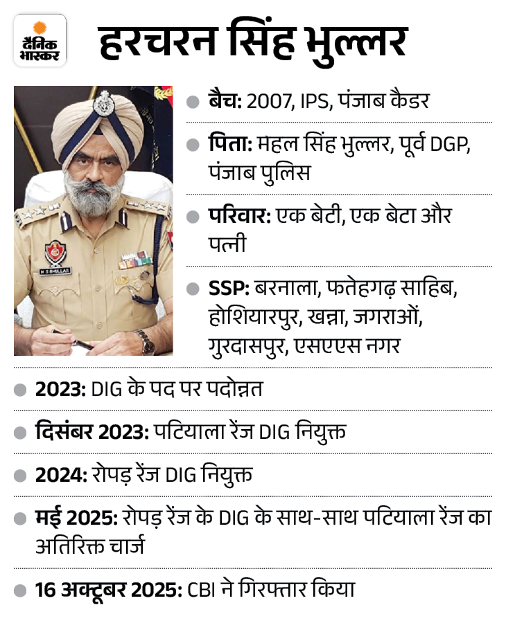 पंजाब पुलिस के रोपड़ रेंज के DIG हरचरण सिंह भुल्लर को CBI ने रिश्वत लेते गिरफ्तार किया है। भुल्लर 2007 बैच का IPS अधिकारी है। वह मूल रूप से पटियाला का रहने वाला है। उसके पिता महल सिंह भुल्लर पंजाब के पूर्व डायरेक्टर जनरल ऑफ पुलिस (DGP) रह चुके हैं, जब