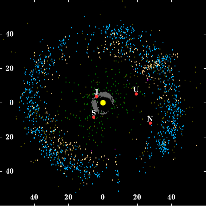 Visual: In this diagram, J, S, U, and N are the solar system’s giant planets. What’s the collective name for the objects in blue?