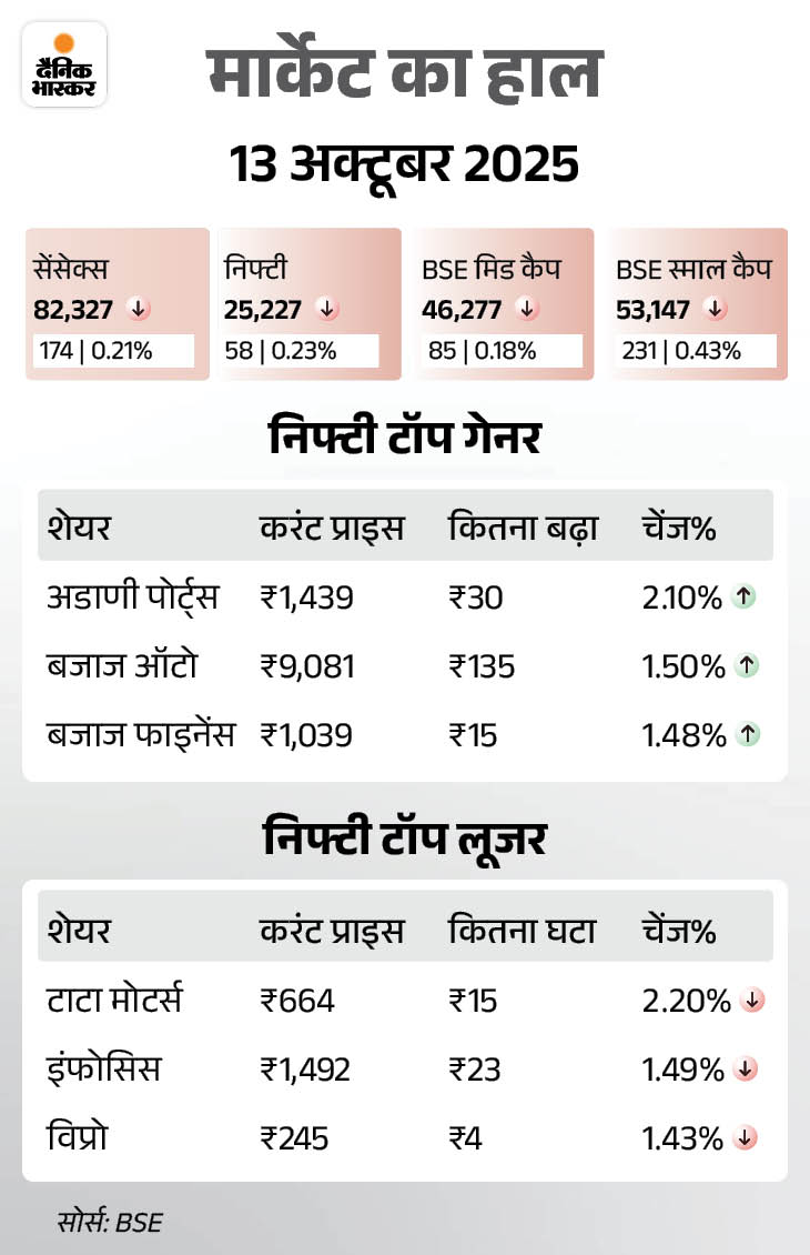 हफ्ते के पहले कारोबारी दिन सोमवार, 13 अक्टूबर को सेंसेक्स 174 अंक गिरकर 82,327 पर बंद हुआ। निफ्टी में भी 58 अंक की गिरावट रही, ये 25,227 पर बंद हुआ।
