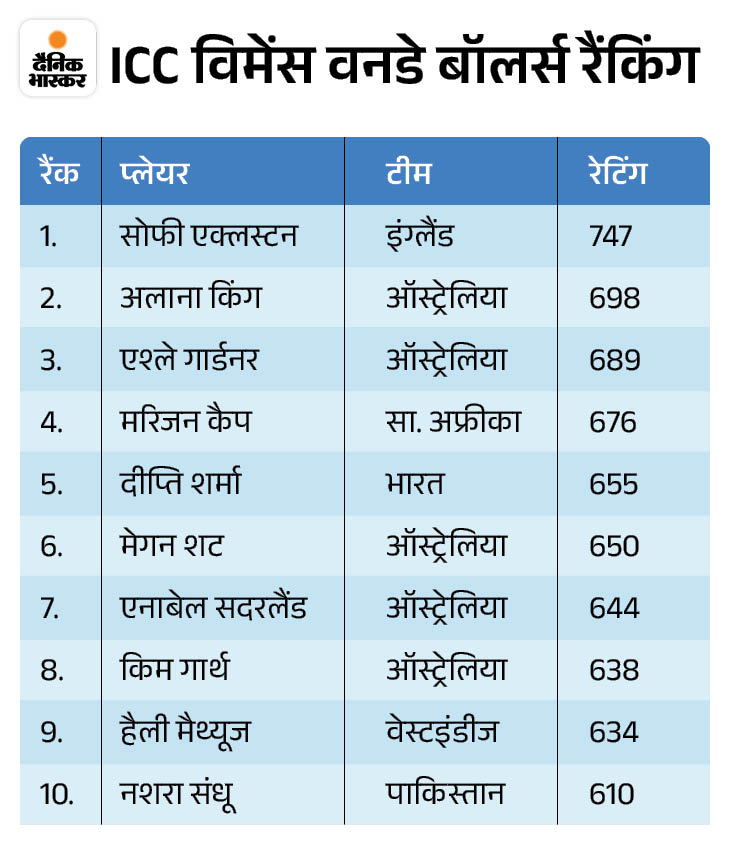 सोफी एक्लस्टन नंबर-1 पर गेंदबाजों की रैंकिंग में इंग्लैंड की सोफी एक्लस्टन 747 पॉइंट्स के साथ अब भी टॉप पर हैं। लेकिन अब उन्हें ऑस्ट्रेलिया की लेग-स्पिनर अलाना किंग कड़ी टक्कर दे रहीं हैं। किंग ने साउथ अफ्रीका के खिलाफ 7 विकेट लेकर पांच स्थान की छलांग लगाई और 698 पॉइंट्स के साथ दूसरे नंबर पर पहुंच गईं। गार्डनर एक स्थान फिसलकर तीसरे नंबर (689) पर आ गईं।