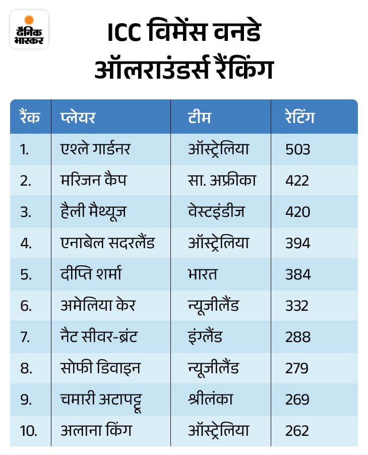 एनाबेल सदरलैंड चौथे नंबर पर हैं, जबकि उनकी साथी अलाना किंग तीन स्थान ऊपर बढ़कर टॉप-10 में शामिल हो गई हैं। दीप्ति शर्मा को ऑलराउंडर्स रैंकिंग में भी एक स्थान का नुकसान हुआ है। वे अब 384 रेटिंग पॉइंट्स के साथ पांचवें पायदान पर आ गईं हैं।