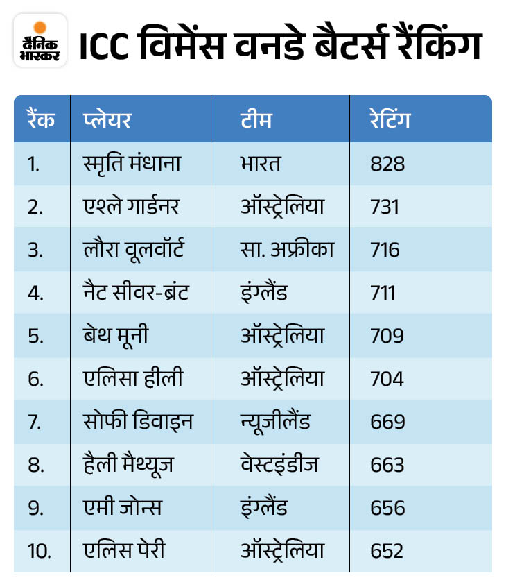 स्मृति मंधाना के वनडे करियर में 828 रेटिंग पॉइंट्स हो गए हैं।