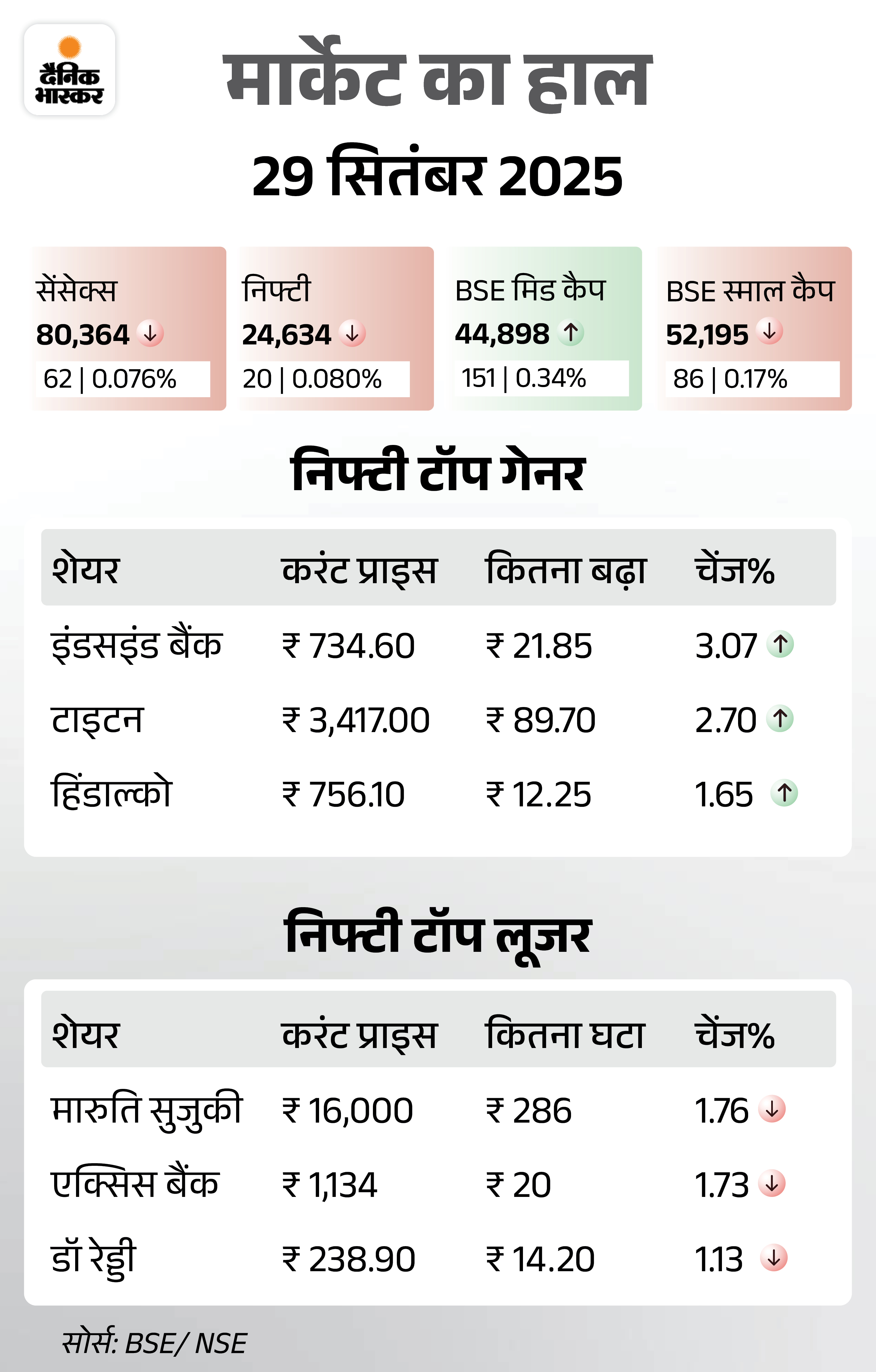 हफ्ते के पहले कारोबारी दिन सोमवार, 29 सितंबर को शेयर बाजार में उतार-चढ़ाव देखने को मिला था। सेंसेक्स 62 अंक गिरकर 80,364 के स्तर पर बंद हुआ। वहीं निफ्टी में 20 अंक की गिरावट रही, ये 24,634 के स्तर पर बंद हुआ। सेंसेक्स के 30 शेयरों में से 16 शेयर्स में तेजी और 14 शेयर्स में गिरावट रही थी।