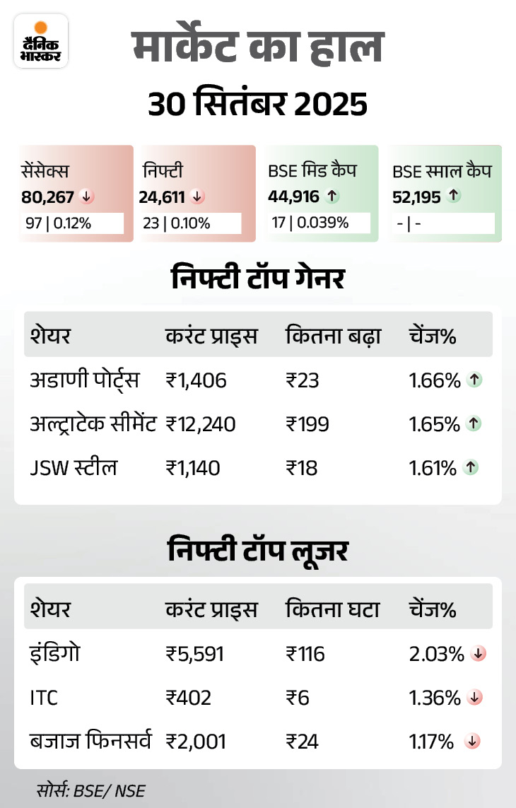 हफ्ते के दूसरे कारोबारी दिन मंगलवार, 30 सितंबर को शेयर बाजार गिरकर बंद हुआ। सेंसेक्स 97 अंक गिरकर 80,267 के स्तर पर बंद हुआ। निफ्टी में भी 23 अंक की गिरावट रही, ये 24,611 के स्तर पर बंद हुआ। सेंसेक्स के 30 शेयरों में से 16 शेयर्स में तेजी और 14 शेयर्स में गिरावट रही।
