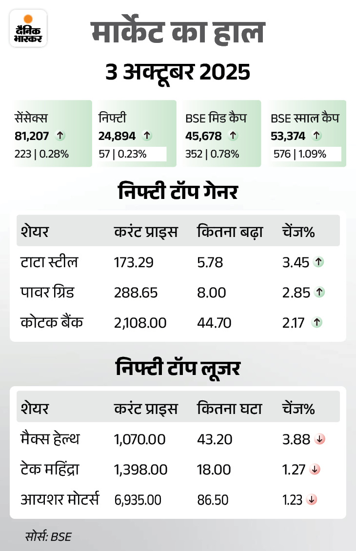 3 अक्टूबर को शेयर बाजार तेजी के साथ बंद हुआ। सेंसेक्स 223 अंक की तेजी के साथ 81,207 के स्तर पर बंद हुआ। वहीं निफ्टी भी 57 अंक चढ़कर 24,894 के स्तर पर बंद हुआ।