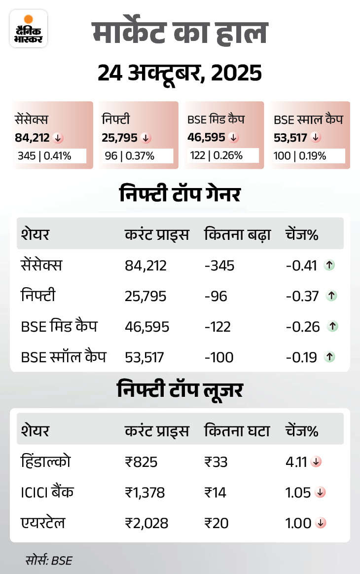 शुक्रवार, 24 अक्टूबर को सेंसेक्स 345 अंक गिरकर 84,212 पर बंद हुआ। निफ्टी में 97 अंक की गिरावट रही, ये 25,795 पर बंद हुआ।