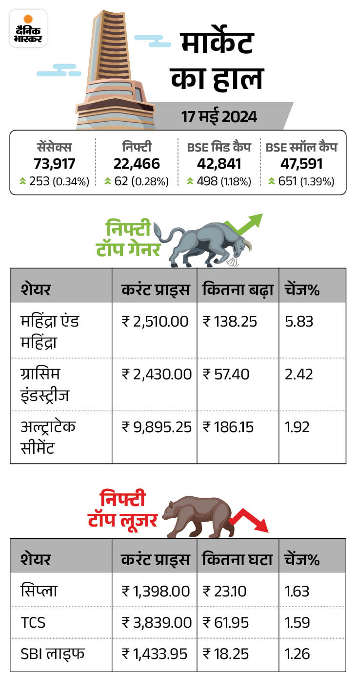 शेयर बाजार में आज यानी 17 मई को तेजी देखने मिली। सेंसेक्स 253 अंक की तेजी के साथ 73,917 के स्तर पर बंद हुआ।