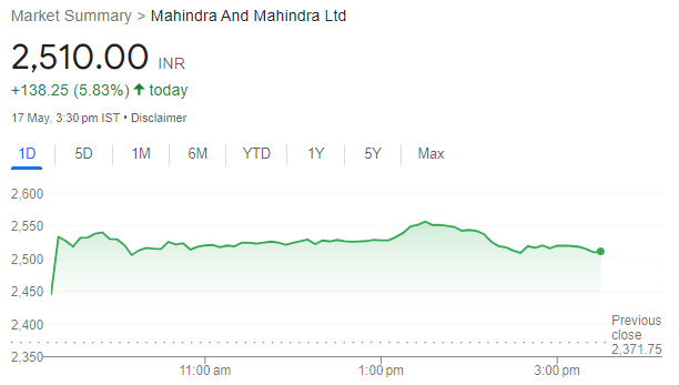 महिंद्रा एंड महिंद्रा का शेयर आज ₹2,557 का ऑल टाइम हाई बनाया। हालांकि, बाद में यह थोड़ा नीचे आकर सुबह 5.83% की तेजी के साथ 2,510 के स्तर पर बंद हुआ। इसी के साथ महिंद्रा का शेयर निफ्टी का टॉप गेनर रहा।