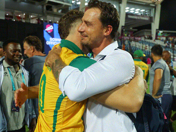 साउथ अफ्रीका के पूर्व गेंदबाज डेल स्टीन ने जीत के बाद डेविड मिलर को गले लगाया। स्टेन साउथ अफ्रीका के सभी फॉर्मेट में दूसरे टॉप विकेट टेकर हैं।