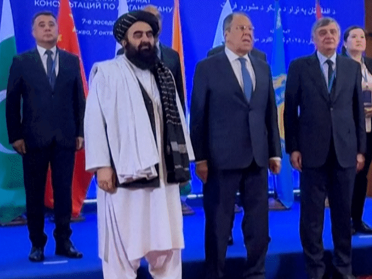 अफगानिस्तान के विदेश मंत्री मुत्तकी 7 अक्टूबर को मॉस्को में रूसी विदेश मंत्री सर्गेई लावरोव के साथ। इस दौरान बैकग्राउंड में तालिबान का झंडा लगा था।
