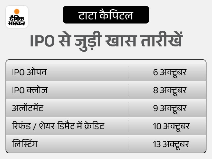 IPO के जरिए टाटा कैपिटल 15,512 करोड़ रुपए जुटाना चाहती है। इससे पहले कंपनी ने 3 अक्टूबर को 135 एंकर निवेशकों से 4,641.8 करोड़ रुपए जुटाए हैं।