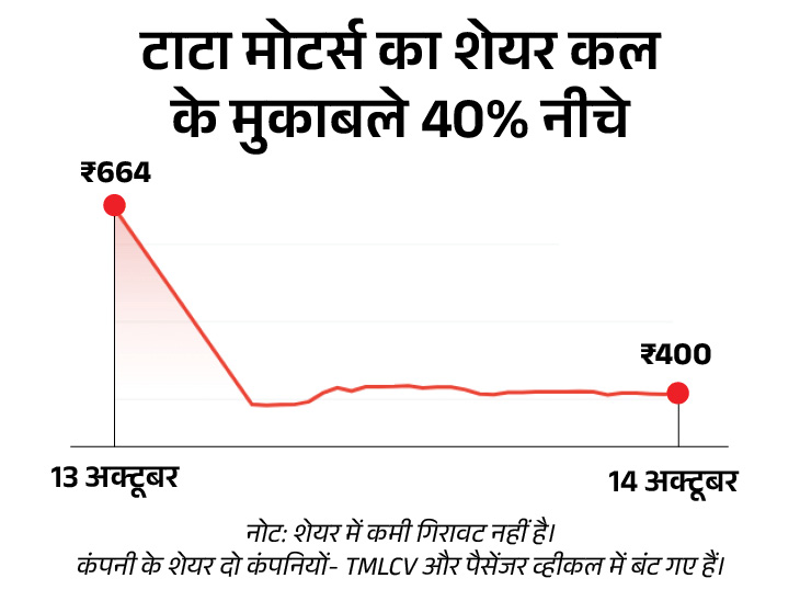 ये कोई गिरावट नहीं है। कंपनी अलग हो गई है तो शेयर बंटा है, इसलिए यह कम दिख रहा है। टाटा मोटर्स कॉमर्शियल व्हीकल (CV) का बराबर शेयर निवेशकों को मिलेगा। दोनों को जोड़ने के बाद आपका निवेश उतना ही होगा जितना आपने पहले किया था।