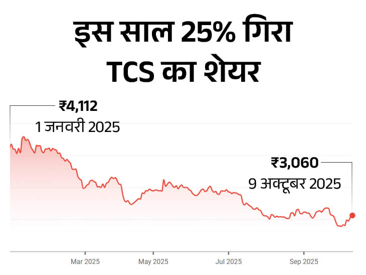 वित्त वर्ष 2025-26 की दूसरी तिमाही के नतीजों से पहले TCS का शेयर आज यानी 9 अक्टूबर को 33 रुपए चढ़कर 3,060 रुपए पर बंद हुआ। बीते एक महीने में कंपनी का शेयर 0.35%, छह महीने में 5.74%, एक साल में 28.05% और इस साल यानी 1 जनवरी से अब तक 25.59% गिरा है। कंपनी की मार्केट वैल्यू 11.08 लाख करोड़ रुपए है।