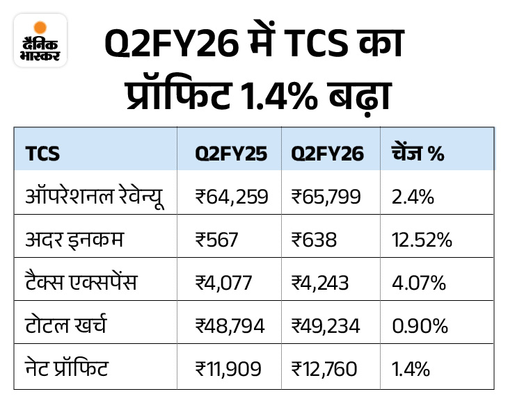 टाटा ग्रुप की कंपनी टाटा कंसल्टेंसी सर्विसेज (TCS) को वित्त वर्ष 2025-26 की दूसरी तिमाही में 12,075 करोड़ रुपए का मुनाफा (कॉन्सोलिडेटेड नेट प्रॉफिट) हुआ है। सालाना आधार पर इसमें 1.4% की बढ़ोतरी हुई है। पिछले वित्त वर्ष की समान तिमाही में कंपनी को 11,909 करोड़ रुपए का मुनाफा हुआ था।