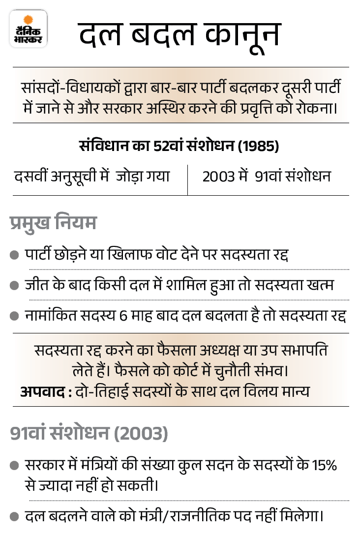 इसमें कहा गया कि अगर कोई विधायक या सांसद अपनी मर्जी से पार्टी की सदस्यता छोड़कर दूसरी पार्टी जॉइन कर लेता है तो वो दल-बदल कानून के तहत सदन से उसकी सदस्यता जा सकती है। अगर कोई सदस्य सदन में किसी मुद्दे पर मतदान के समय अपनी पार्टी के व्हिप का पालन नहीं करता है, तब भी उसकी सदस्यता जा सकती है।