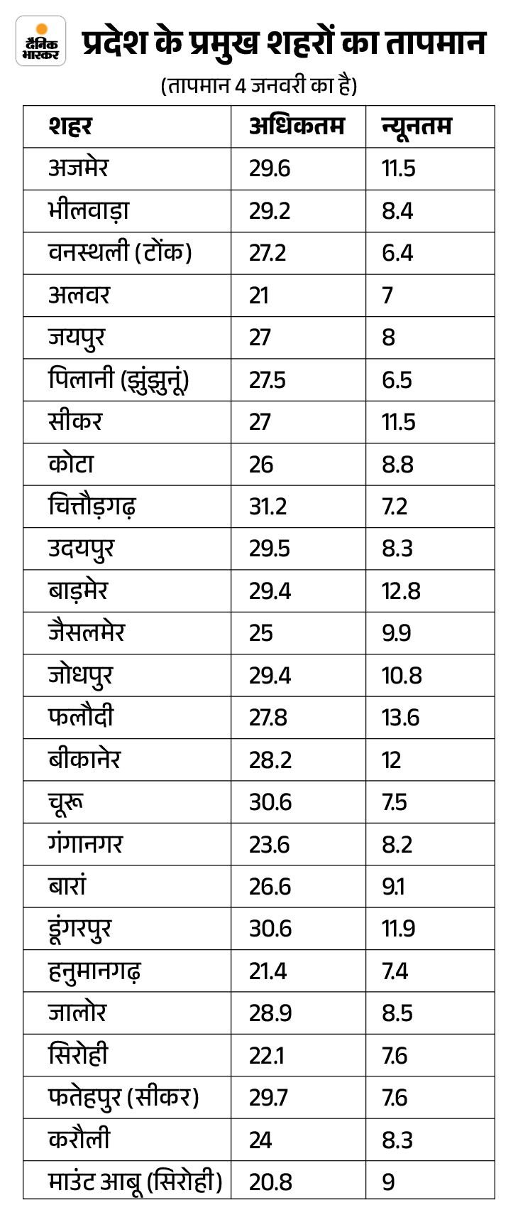 सबसे ज्यादा तापमान चित्तौड़गढ़ में सबसे ज्यादा तापमान शनिवार को चित्तौड़गढ़ जिले में दर्ज हुआ। यहां अधिकतम तापमान 31.2 डिग्री सेल्सियस तक पहुंच गया। चूरू, डूंगरपुर में कल अधिकतम तापमान 30.6, अजमेर में 29.6, भीलवाड़ा में 29.2, उदयपुर में 29.5, बाड़मेर-जोधपुर में 29.4, फतेहपुर में 29.7 और जालोर में 28.9 डिग्री सेल्सियस तापमान दर्ज हुआ।