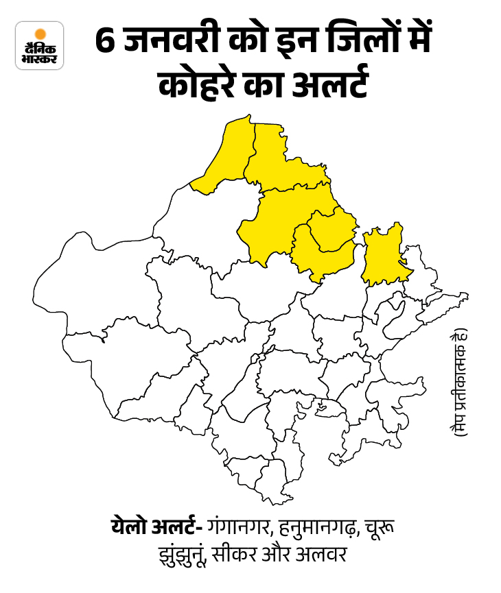 अब आगे क्या? जयपुर मौसम केन्द्र ने आज बीकानेर, गंगानगर, हनुमानगढ़ जिलों में हल्की बारिश होने की संभावना जताई है। 7 और 8 जनवरी को प्रदेश में मौसम ड्राय रहेगा। उत्तरी हवा फिर से शुरू होने से न्यूनतम-अधिकतम तापमान में 2 से 3 डिग्री सेल्सियस तक की गिरावट होगी, जिससे सर्दी तेज होगी। उधर, 6 जनवरी को 6 जिलों में कोहरे का येलो अलर्ट भी जारी किया गया है।