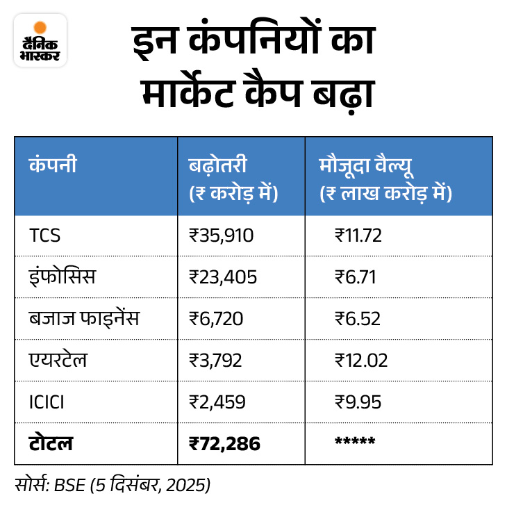 मार्केट वैल्यूएशन के लिहाज से देश की 10 सबसे बड़ी कंपनियों में से 5 की वैल्यू इस हफ्ते के कारोबार में ₹72,286 करोड़ बढ़ी है। इस दौरान टाटा कंसल्टेंसी सर्विसेज (TCS)टॉप गेनर रही। कंपनी का मार्केट कैप ₹35,910 करोड़ बढ़कर ₹11.72 लाख करोड़ पहुंच गया है।