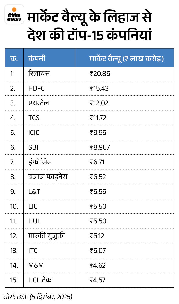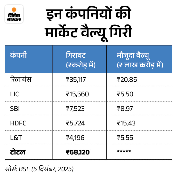 इधर, देश की सबसे बड़ी कंपनी रिलायंस इंडस्ट्रीज की वैल्यू 35,117 करोड़ रुपए कम होकर ₹20.85 लाख करोड़ पर आ गई है। वहीं सरकारी बीमा कंपनी लाइफ इंश्योरेंस कॉर्पोरेशन ऑफ इंडिया (LIC) की वैल्यू ₹15,560 करोड़ गिरकर ₹5.50 लाख करोड़ रह गई है।