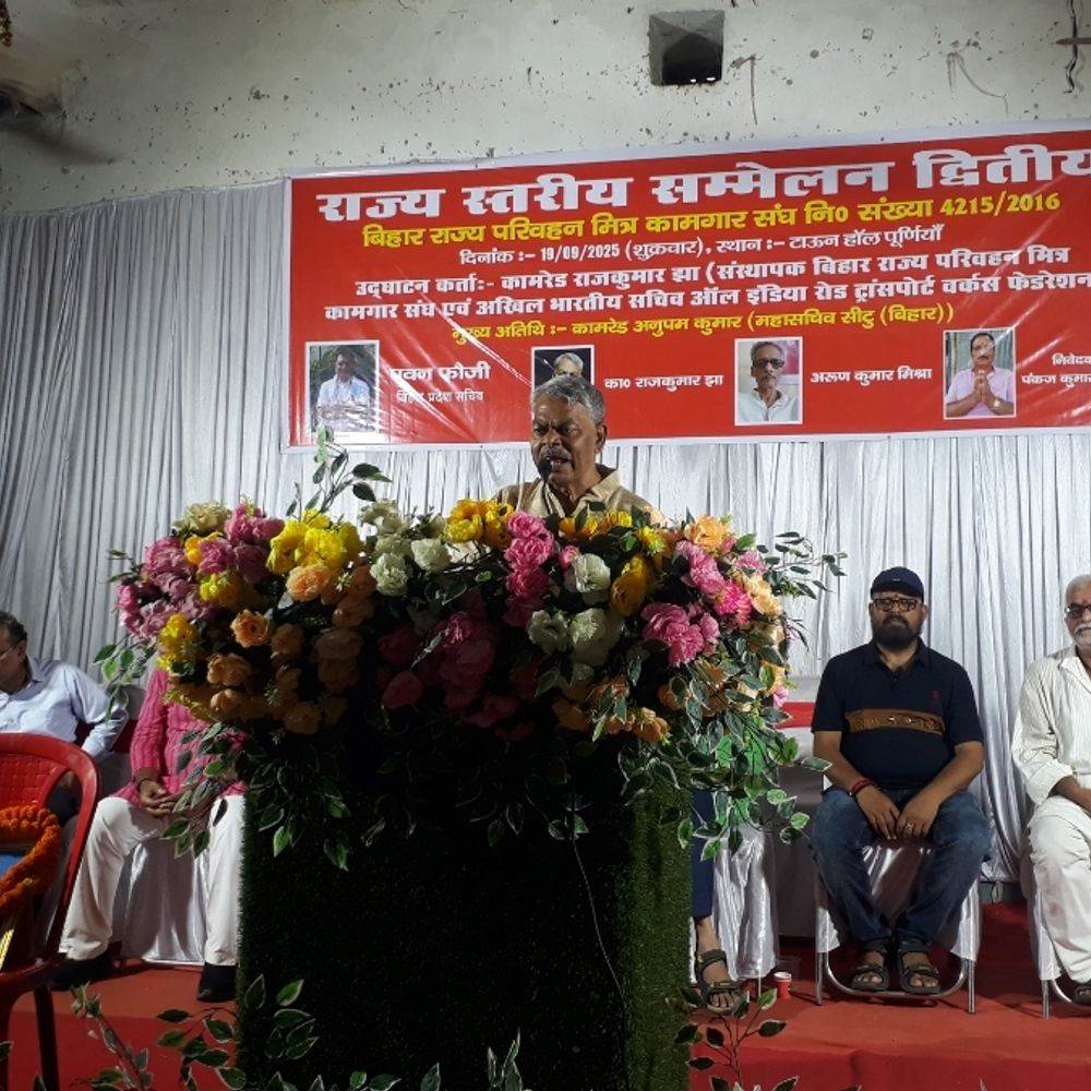 संस्थापक सह अखिल भारतीय सचिव कामरेड राज कुमार झा ने कहा कि ये सभी लोग जानते हैं कि टेम्पो, ट्रैक्टर के फिटनेस के लिए 600 रुपए का चालान जमा होता है, लेकिन गाड़ी मालिकों से एमवीआई व डीटोओ के निजी दलाल 4 हजार रुपये लेते हैं। वहीं, लर्निंग लाइसेंस के लिए 700 रुपये का चालान काटा जाता है लेकिन ढाई से तीन हजार लगता है। बिना रुपये दिए काम ही नहीं बढ़ता है। उन्होंने कहा कि परिवहन विभाग में लूट की छूट मिली है। सभी परिवहन मित्र कामगारों से संगठन को और मजबूत करने का आह्वान किया। कहा कि आज परिवहन विभाग में कम्प्यूटर ऑपरेटर से लेकर अन्य कर्मी ठेका पर रखे जाते हैं। जबकि अगर सरकार चाहे तो परिवहन मित्र को रोजगार दे सकती है। परिवहन क्षेत्र में रोजगार की अपार संभावनाएं है। उन्होंने कहा कि सरकार के द्वारा फोटो खिंचवा कानून लगाया गया है। जिससे आम लोगों की परेशानी बढ़ गई है। इसमें जिनकी गाड़ी घर में है उनके नाम से भी चालान कट रहा है। कई उदाहरण आए दिन खबरों में देखने को मिल रहा है।