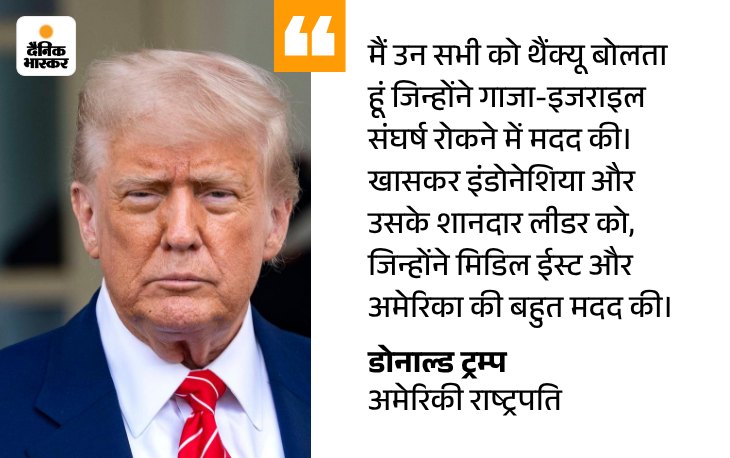 ट्रम्प ने कहा- मेरे दोस्त देशों ने कहा है कि अगर हमास ने गलत हरकतें करता रहा तो वे गाजा में जाकर उसे ठीक करेंगे। उन्होंने कहा कि मिडिल ईस्ट में इतना प्यार और उत्साह हजारों साल में नहीं देखा गया। ये बहुत खूबसूरत है।