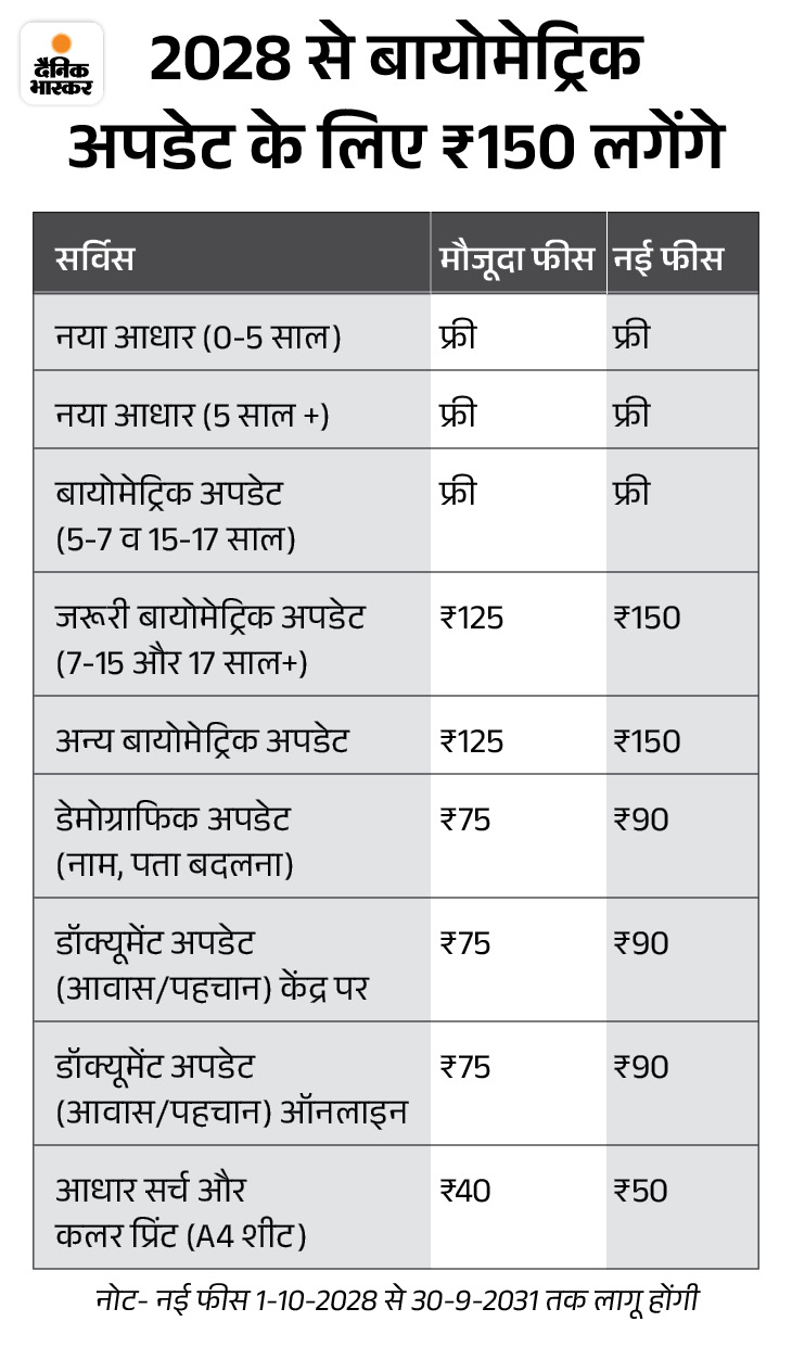 5-7 साल के बच्चों और 15-17 साल के टीनएजर्स के लिए बायोमेट्रिक अपडेट्स फ्री रहेगा। 7-15 साल के बच्चों के लिए भी 30 सितंबर 2026 तक बायोमेट्रिक अपडेट फ्री है। अन्य बायोमेट्रिक अपडेट्स के लिए 125 रुपए देने होंगे।