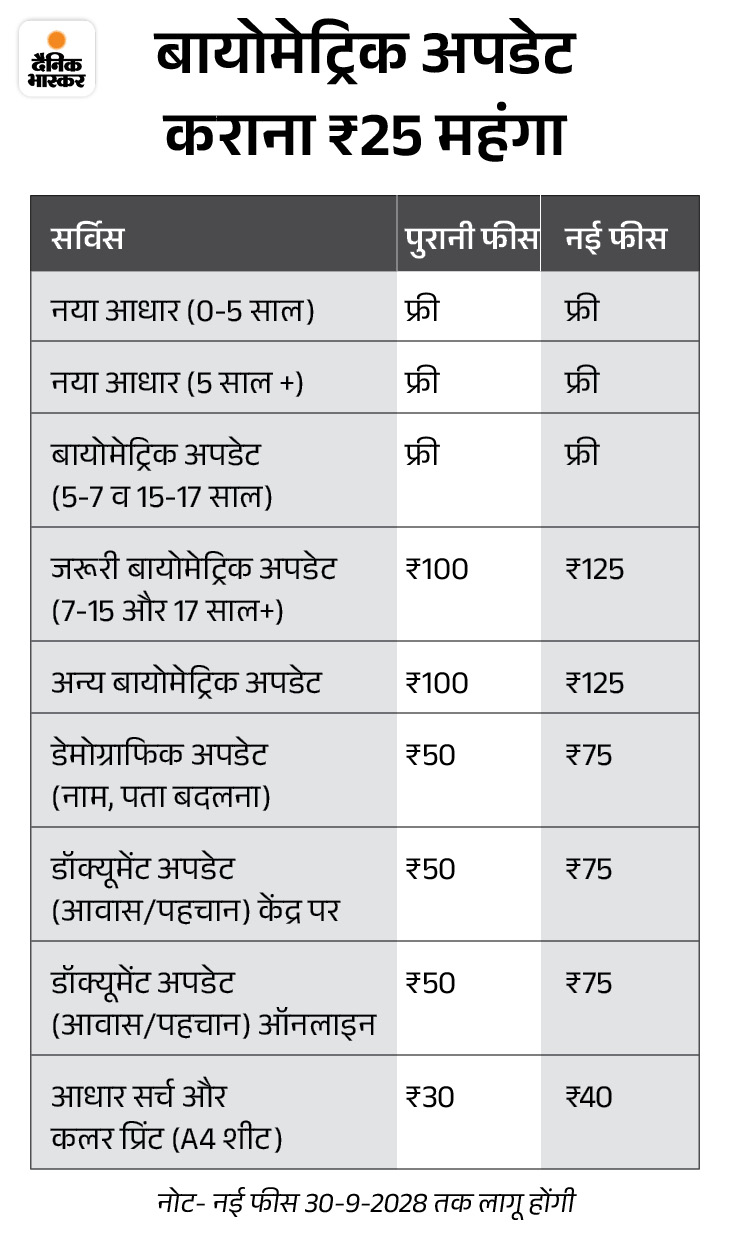 यूनिक आइडेंटिफिकेशन अथॉरिटी ऑफ इंडिया (UIDAI) ने आधार अपडेट करने की फीस 25 रुपए तक बढ़ा दी हैं। नई फीस 1 अक्टूबर से लागू कर दी गई है, जो 30 सितंबर 2028 तक प्रभावी रहेंगी। इसके बाद फिर से समीक्षा होगी और 1 अक्टूबर 2028 से 30 सितंबर 2031 तक के लिए फीस में बदलाव होगा।