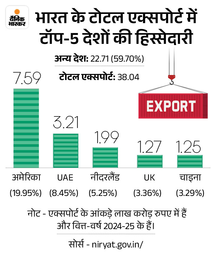 अमेरिका भारत का सबसे बड़ा व्यापारिक साझेदार है और भारत के टोटल मर्चेंडाइज एक्सपोर्ट यानी कुल माल निर्यात का 18% हिस्सा अमेरिका को जाता है।