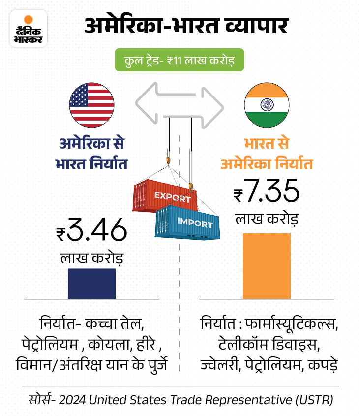 जवाब: भारत और अमेरिका के बीच 2024-25 में बायलैटरल ट्रेड 131.84 बिलियन डॉलर (11.6 लाख करोड़ रुपए) रहा, जिसमें 86.5 बिलियन डॉलर यानी 7.6 लाख करोड़ रुपए का एक्सपोर्ट भारत से हुआ है।