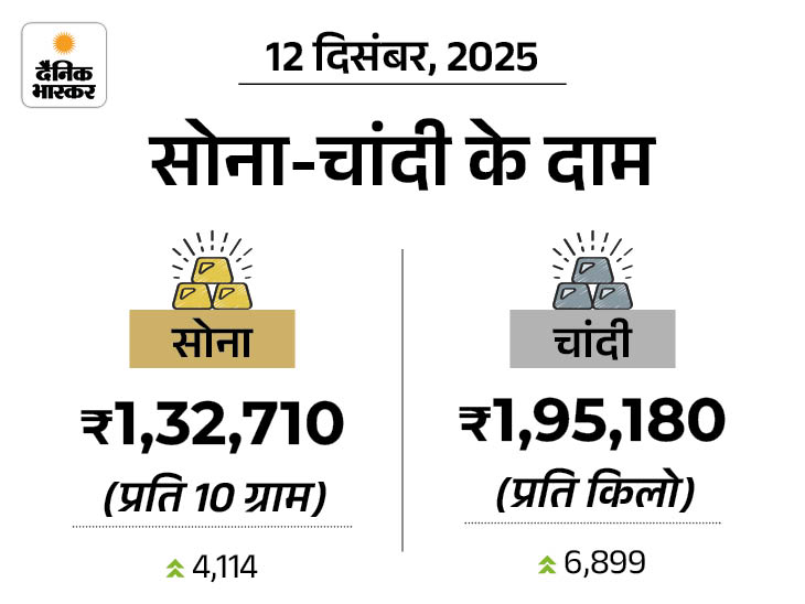 सोने और चांदी की कीमत आज (12 दिसंबर) ऑल टाइम पर पहुंच गईं। इंडिया बुलियन एंड ज्वेलर्स एसोसिएशन (IBJA) के अनुसार, 10 ग्राम सोने की कीमत 4,114 बढ़कर 1,32,710 हो गई है, जो अब तक का सबसे ऊंचा स्तर है।